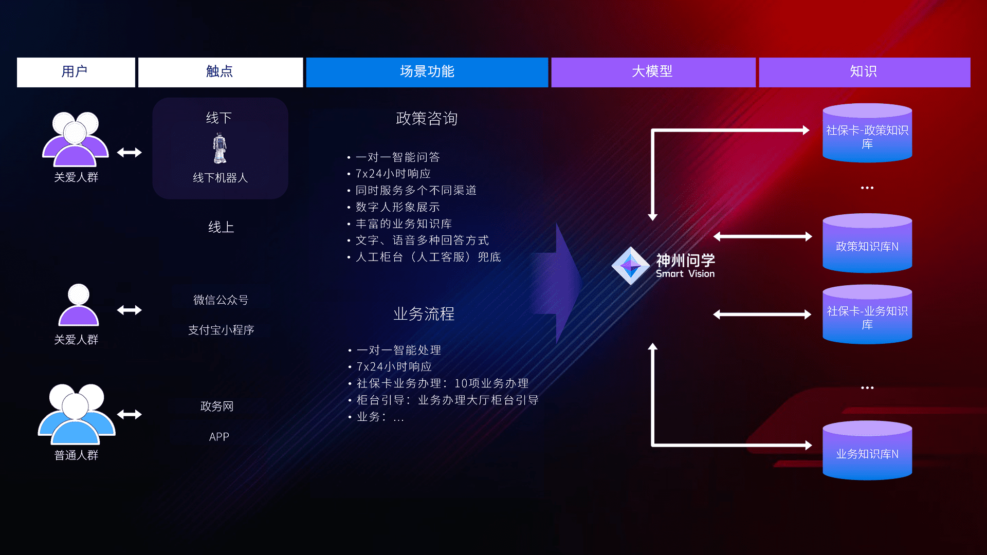 • 线上线下全覆盖:线上提供微信公众号、、、支付宝小程序、、、政务网、、、app多种渠道,,,与线下机器人形成完整服务体系。。。